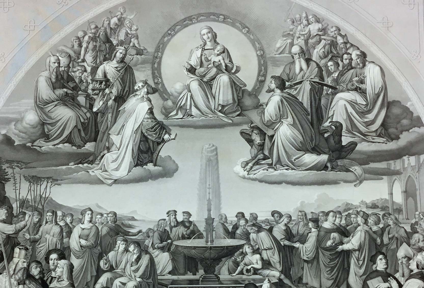 An die hundert Künstler, bibliche Gestalten, Kaiser, Papst und Mönche sind versammelt und huldigen der Mutter Gottes mit dem Jesuskind. Überhöht thronen letztere über dem Brunnen mit dem Wasser des ewigen Lebens.
